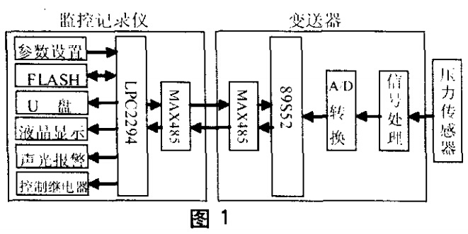 本安全監控儀由兩個部分組成:一個與傳感器相連,用于采集重量的前端變送器;一個用于參數修改設置和數據存儲管理的監控記錄儀。變送器的功能是將從傳感器過來的模擬電壓轉換為對應的重量數據并即時通過電纜傳送到監控記錄儀;監控記錄儀將從變送器傳送來的重量實時顯示在液晶屏上,同時對吊車的載重狀態(過載或報警)做出判斷,并輸出相應動作。兩機由四芯屏蔽電纜連接,用MAX485進行數字通信。這樣就解決了模擬信號傳送易受干擾的問題。系統硬件結構框圖如圖l所示。