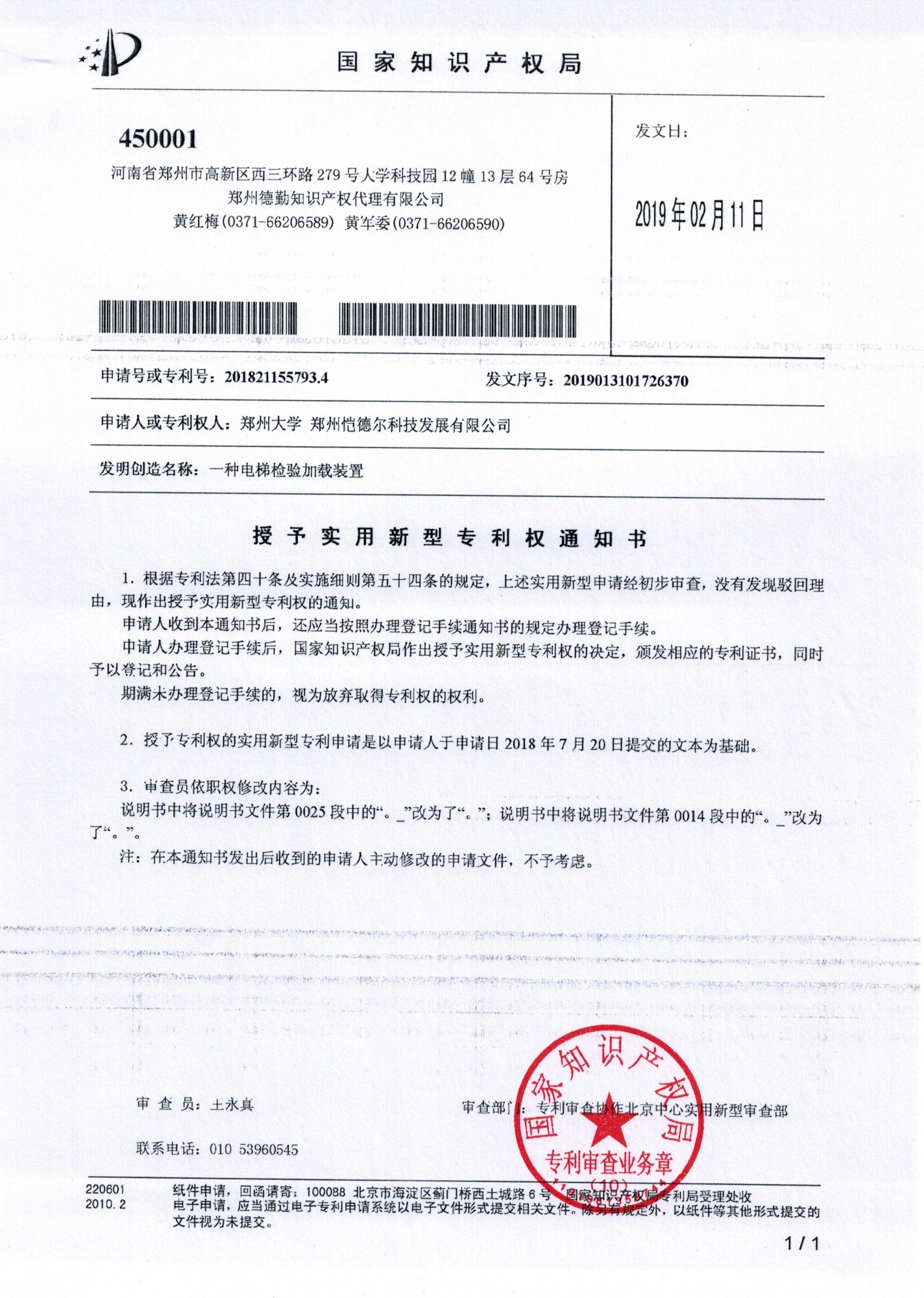 近日,由鄭州愷德爾科技發(fā)展有限公司撰寫申請的“一種電梯檢驗加載裝置”獲得國家專利局授權(quán)!